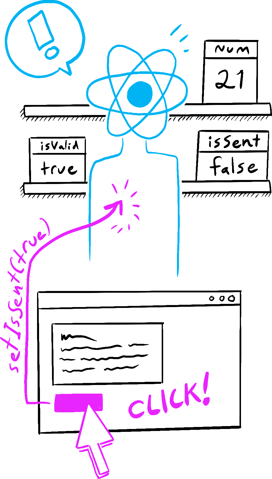 import { useState } from 'react'; export default function Form() { const [isSent, setIsSent] = useState(false); const [message, setMessage] = useState('Ćao!'); if (isSent) { return <h1>Vaša poruka je na putu!</h1> } return ( <form onSubmit={(e) => { e.preventDefault(); setIsSent(true); sendMessage(message); }}> <textarea placeholder="Poruka" value={message} onChange={e => setMessage(e.target.value)} /> <button type="submit">Pošalji</button> </form> ); } function sendMessage(message) { // ... }
